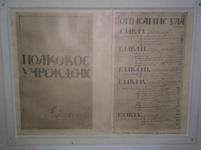 | Keywords: PolkovojeUchrezhd.JPG Composition of Suvorov Фотокопия укописи оглавления книги Суво ова Полковое уч еждение Το εξώφυλλο του στρατιωτικού βιβλίου «Εγκατάσταση Συντάγματος» το ο οίο έγραψε ο Αλέξανδρος το 1764-1765 και το ο οίο α οτελείται α ό 6 κεφάλαια Own 08 12 2007 Alexander Sokolov Suvorov Museum Kobrin Alexander Suvorov Cyrillic writing |