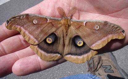| Keywords: PolyphemusFlashingJune6th2009.png en This is a polyphemus moth in the process of defensively flashing his underwings to show the eyespots and trembling them for added effect The motion did not cause blur due to the sunniness of the morning it allowed the camera's automatic exposure process to use a fast shutter speed as well as a small aperture and therefore a tight depth of focus He had been sleeping perched on an exterior lamp I coaxed him off gently with a twig He gradually awoke eventually giving me this defensive display for about 2 seconds and then flew off to a safer roost under a deck Own Organic 2009-06-06 The exact location 43 1 11 40 N 76 11 32 00 W I have assessed the moth as male due to the large size of the antennae I was able to measure corresponding points on my hand to conclude that his wingspan is very close to exactly 6 inches Antheraea polyphemus Insect eyespot |