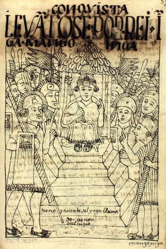 Keywords: POMA0400v.jpg The newly reigning Manco Inka in his ceremonial throne in Cuzco cite book Felipe Guaman Poma de Ayala 1615 El primer nueva corónica y buen gobierno Peru p 400 http //www kb dk/permalink/2006/poma/info/en/frontpage htm The chapter of the Spanish conquest and the civil wars http //www kb dk/permalink/2006/poma/400/en/image/ open id2642390 imagesize XL 2008-07-28 1615 Felipe Guaman Poma de Ayala ca 1535 1616 PD-old-100-1923 Manco Inca Felipe Guamán Poma de Ayala |