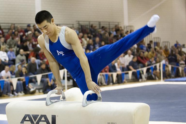 Keywords: pommel horse gymnastics male device apparatus routine performance exercise fitness man strength poise athlete concentration power competition equipment college