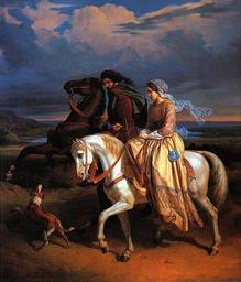 | Keywords: Pompeo Molmenti - Pia de' Tolomei condotta in Maremma.jpg Artwork Creator Pompeo Marino Molmenti en Pia de' Tolomei Being Led to Maremma «Con questo dipinto esposto a Venezia nel 1853 l'artista affrontava per la prima volta il soggetto storico d'ispirazione letteraria caro alla cultura romantica Il tema tratto dal poemetto colmo di suggestioni medievaleggianti di Bartolomeo Sestini che tanto successo ebbe nel primo Ottocento si sofferma su un episodio trascurato dai pittori quello del mesto viaggio della Pia verso la sua prigione maremmana Le figure dei due viaggiatori minuziosamente descritte si stagliano sul paesaggio del litorale toscano reso cupo e malinconico dalla giornata nuvolosa in patetica armonia con lo stato d'animo della giovane sposa desolata Anche gli animali riflettono i sentimenti dei protagonisti focoso e irruento l'uno remissivo e al passo quello della Pia » Vedi fonte p 232 1853 oil canvas cm 102 82 Musei Civici Verona object history exhibition history credit line accession number place of creation Silvana Bietoletti Michele Dantin L'Ottocento italiano la storia gli artisti le opere Giunti Editore 2002 http //books google it/books id 5AmBboSoKQoC pg PA233 p 233 http //www palazzodellaragioneverona it/gam-achielle-forti/le-opere-dell-allestimento/photo/107 html Galleria d'Arte Moderna Achille Forti “ http //www palazzodellaragioneverona it/images/jartists/med/1395402910 jpg image Custom license marker 2013 02 18 PD-old-auto 1894 Uploaded with UploadWizard Pompeo Marino Molmenti Pia de' Tolomei Horse riding in paintings Black horses in art White horses in art Romantic paintings of horses Romantic history paintings Romantic paintings in Italy Maremma 1853 oil on canvas paintings Paintings by Pompeo Marino Molmenti in the Museo di Castelvecchio Verona |