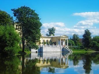 Keywords: pond pavilion reflection architecture sights sky in day handsomely trees water sunny day beautiful building peterhof