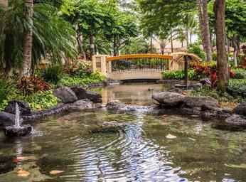 Keywords: pond resort bridge koi pond outdoors nature water resort landscape tourism travel holiday summer green vacation tropical garden scenic natural outdoor