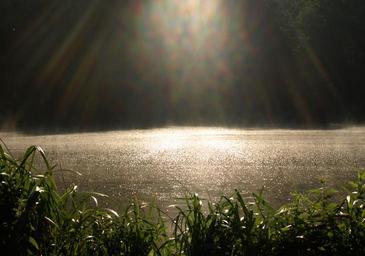 Keywords: pond surface fog day light nature sun rays