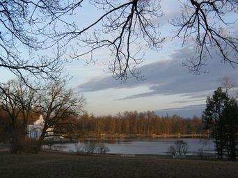Keywords: pond trees branches silhouette dark cloudy sky landscape water buildings outdoors evening