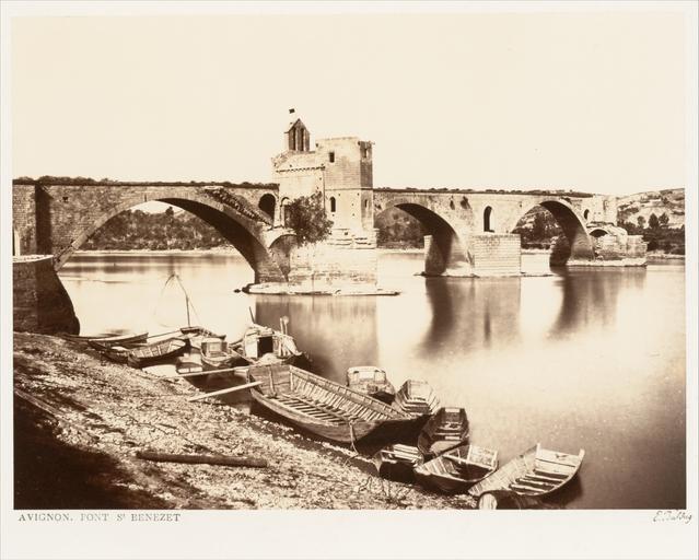 | Keywords: Pont Saint-Bénezet-Denis.jpg Pont Saint-Bénezet also known as the Pont d'Avignon ~ 1864 Albumen silver print from glass negative Image 21 1 x 28 5 cm 8 5/16 x 11 1/4 in Mount 46 x 60 5 cm 18 1/8 x 23 13/16 in Institution Metropolitan Museum of Art met online 287332 credit line Gilman Collection Gift of The Howard Gilman Foundation 2005 accession number 2005 100 364 25 Other versions PD-old-100 Pont Saint-Bénézet by Édouard Baldus 1864 photographs | ||||