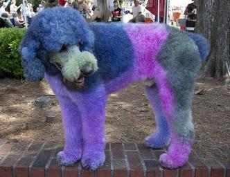 Keywords: poodle dyed dog coat blue parade fun cute pet show street canine colorful fur hair