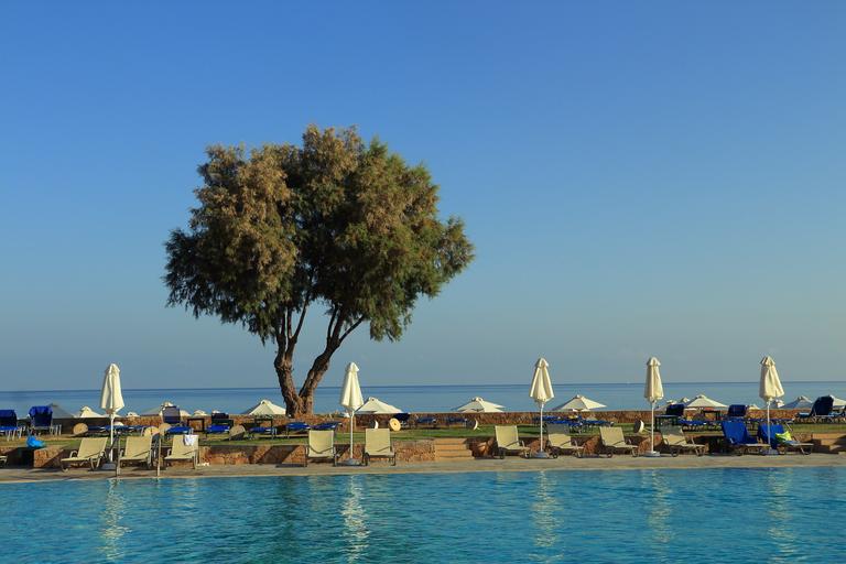Keywords: pool sea swimming pool crete tree deck chair parasol
