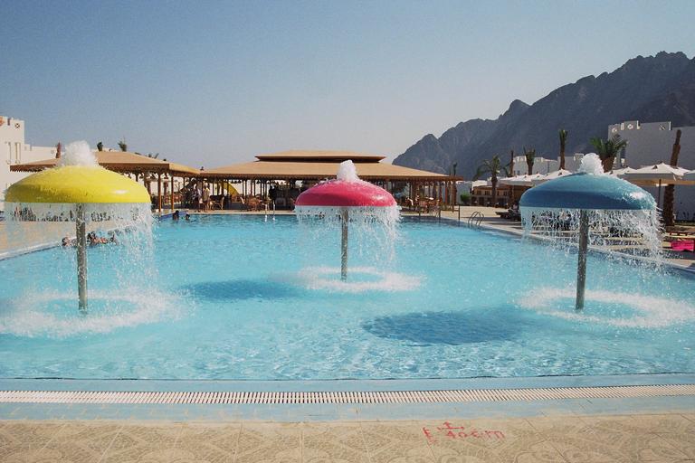 Keywords: pool swimming pool holiday travel summer luxury luxurious elegant resort tourism turquoise water colorful mushrooms screens fountain yellow red blue refreshment scan