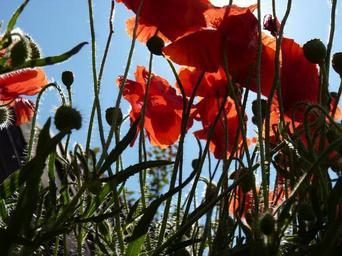 Keywords: poppies red flowers blossoms fields blooms blooming wild flowering plants floral buds green stems leaves blue sky gardens gardening thick dense nature backlight