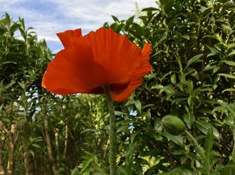 Keywords: poppy flower flower plant garden nature red green bud leaves sky blue white tender fragile garden plant bed