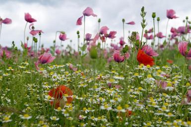 Keywords: poppy meadow wildflowers summer meadow summer flower blossom bloom field nature colorful field of poppies pink poppy poppy flower chamomile red poppy klatschmohn natural lawn bloom