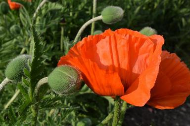 Keywords: poppy orange blossom bloom field of poppies bud sunshine light early summer
