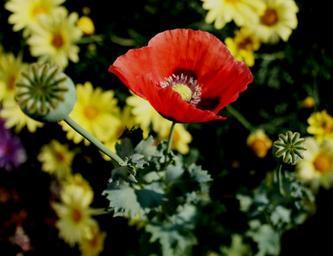 Keywords: poppy red daisies yellow happy bright garden flowers delicate