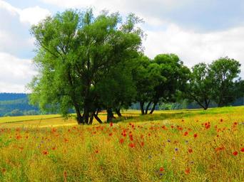 Keywords: poppy red klatschmohn field flower meadow trees nature colorful