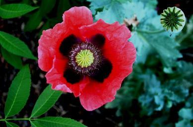 Keywords: poppy red open flower bloom centre black yellow intricate foliage green garden