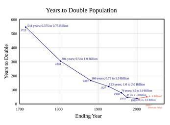 | Keywords: Population-doubling.svg data in 'World Population' article showing number of years taken for World Population to double Two series are interleaved one starting from 0 25 billion the other from 0 375 billion Both the graph and table upon which it is based clearly show the number of years taken for the population to double has been constantly decreasing although current forecasts for future doubling do not Each time the population doubles the actual increase is of course very significantly more than for the previous doubling datos en el artículo 'World Population' que muestran el número de años que le toma a la población mundial duplicarse Se muestra que el número de años que toma a la población mundial duplicarse ha disminuido monótonamente aunque algunas estimaciones muestran que en el futuro no sería así Cada vez que la població se duplica el incremento es mayor a los anteriores Population-doubling jpg 50 2013-04-12 16 31 UTC User Nicoguaro Vectorized version Nicoguaro Population-doubling jpg Uploaded with derivativeFX World population statistics |