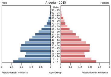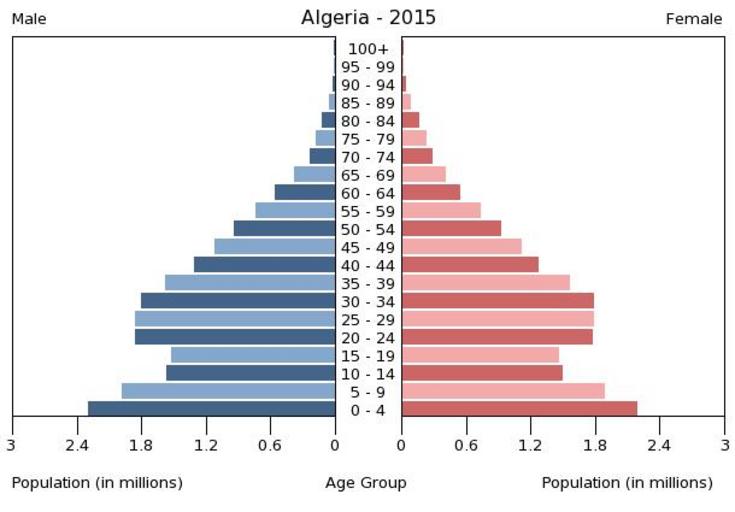 Keywords: Population pyramid of Algeria 2015.png en A population pyramid illustrates the age and sex structure of population and may provide insights about political and social stability as well as economic development The population is distributed along the horizontal axis with males shown on the left and females on the right The male and female populations are broken down into 5-year age groups represented as horizontal bars along the vertical axis with the youngest age groups at the bottom and the oldest at the top The shape of the population pyramid gradually evolves over time based on fertility mortality and international migration trends Віково-статева пі аміда населення Алжи у за 2015 ік Вона дає наочне уявлення п о вікову і статеву ст укту а населення к аїни може слугувати дже елом інфо мації п о політичну і соціальну стабільність економічний озвиток Блакитними кольо ами ліво уч у вигляді го изонтальних смуг показані вікові г упи по 5 оків кожна чоловічої статі п аво уч ожевими жіночої аймолодші вікові г упи внизу найста іші вго і Фо ма пі аміди поступово еволюціонує з плином часу під впливом чинників на оджуваності сме тності і світової міг ації https //www cia gov/library/publications/the-world-factbook/ The World Factbook 2016-09-21 The Central Intelligence Agency Цент альне озвідувальне уп авління PD-USGov Population pyramids of Algeria |