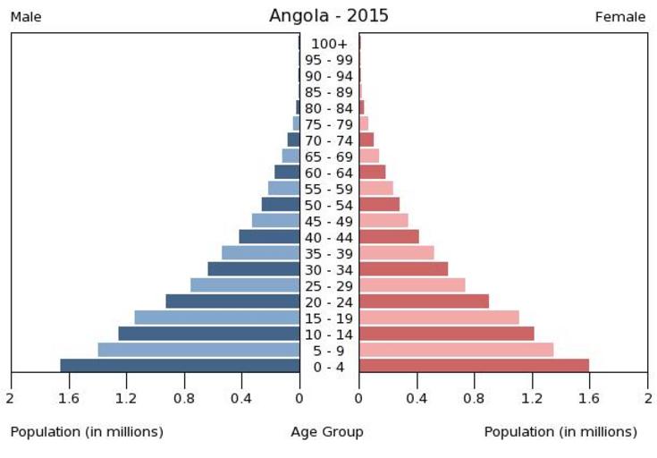 Keywords: Population pyramid of Angola 2015.png en A population pyramid illustrates the age and sex structure of population and may provide insights about political and social stability as well as economic development The population is distributed along the horizontal axis with males shown on the left and females on the right The male and female populations are broken down into 5-year age groups represented as horizontal bars along the vertical axis with the youngest age groups at the bottom and the oldest at the top The shape of the population pyramid gradually evolves over time based on fertility mortality and international migration trends Віково-статева пі аміда населення Анголи за 2015 ік Вона дає наочне уявлення п о вікову і статеву ст укту а населення к аїни може слугувати дже елом інфо мації п о політичну і соціальну стабільність економічний озвиток Блакитними кольо ами ліво уч у вигляді го изонтальних смуг показані вікові г упи по 5 оків кожна чоловічої статі п аво уч ожевими жіночої аймолодші вікові г упи внизу найста іші вго і Фо ма пі аміди поступово еволюціонує з плином часу під впливом чинників на оджуваності сме тності і світової міг ації https //www cia gov/library/publications/the-world-factbook/ The World Factbook 2016-09-21 The Central Intelligence Agency Цент альне озвідувальне уп авління PD-USGov Population pyramids of Angola |