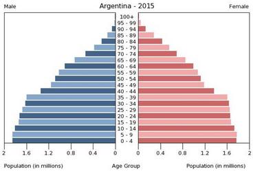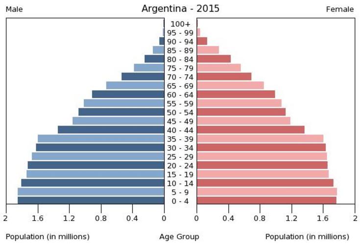 Keywords: Population pyramid of Argentina 2015.png en A population pyramid illustrates the age and sex structure of population and may provide insights about political and social stability as well as economic development The population is distributed along the horizontal axis with males shown on the left and females on the right The male and female populations are broken down into 5-year age groups represented as horizontal bars along the vertical axis with the youngest age groups at the bottom and the oldest at the top The shape of the population pyramid gradually evolves over time based on fertility mortality and international migration trends Віково-статева пі аміда населення А гентини за 2015 ік Вона дає наочне уявлення п о вікову і статеву ст укту а населення к аїни може слугувати дже елом інфо мації п о політичну і соціальну стабільність економічний озвиток Блакитними кольо ами ліво уч у вигляді го изонтальних смуг показані вікові г упи по 5 оків кожна чоловічої статі п аво уч ожевими жіночої аймолодші вікові г упи внизу найста іші вго і Фо ма пі аміди поступово еволюціонує з плином часу під впливом чинників на оджуваності сме тності і світової міг ації https //www cia gov/library/publications/the-world-factbook/ The World Factbook 2016-09-21 The Central Intelligence Agency Цент альне озвідувальне уп авління PD-USGov Population pyramids of Argentina |