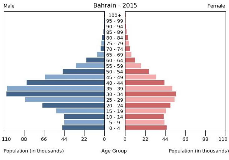 Keywords: Population pyramid of Bahrain 2015.png en A population pyramid illustrates the age and sex structure of population and may provide insights about political and social stability as well as economic development The population is distributed along the horizontal axis with males shown on the left and females on the right The male and female populations are broken down into 5-year age groups represented as horizontal bars along the vertical axis with the youngest age groups at the bottom and the oldest at the top The shape of the population pyramid gradually evolves over time based on fertility mortality and international migration trends Віково-статева пі аміда населення Бах ейну за 2015 ік Вона дає наочне уявлення п о вікову і статеву ст укту а населення к аїни може слугувати дже елом інфо мації п о політичну і соціальну стабільність економічний озвиток Блакитними кольо ами ліво уч у вигляді го изонтальних смуг показані вікові г упи по 5 оків кожна чоловічої статі п аво уч ожевими жіночої аймолодші вікові г упи внизу найста іші вго і Фо ма пі аміди поступово еволюціонує з плином часу під впливом чинників на оджуваності сме тності і світової міг ації https //www cia gov/library/publications/the-world-factbook/ The World Factbook 2016-09-21 The Central Intelligence Agency Цент альне озвідувальне уп авління PD-USGov Population pyramids of Bahrain |