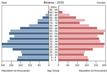 Keywords: Population pyramid of Belarus 2015.png en A population pyramid illustrates the age and sex structure of population and may provide insights about political and social stability as well as economic development The population is distributed along the horizontal axis with males shown on the left and females on the right The male and female populations are broken down into 5-year age groups represented as horizontal bars along the vertical axis with the youngest age groups at the bottom and the oldest at the top The shape of the population pyramid gradually evolves over time based on fertility mortality and international migration trends Віково-статева пі аміда населення Біло усі за 2015 ік Вона дає наочне уявлення п о вікову і статеву ст укту а населення к аїни може слугувати дже елом інфо мації п о політичну і соціальну стабільність економічний озвиток Блакитними кольо ами ліво уч у вигляді го изонтальних смуг показані вікові г упи по 5 оків кожна чоловічої статі п аво уч ожевими жіночої аймолодші вікові г упи внизу найста іші вго і Фо ма пі аміди поступово еволюціонує з плином часу під впливом чинників на оджуваності сме тності і світової міг ації https //www cia gov/library/publications/the-world-factbook/ The World Factbook 2016-09-21 The Central Intelligence Agency Цент альне озвідувальне уп авління PD-USGov Population pyramids of Belarus |