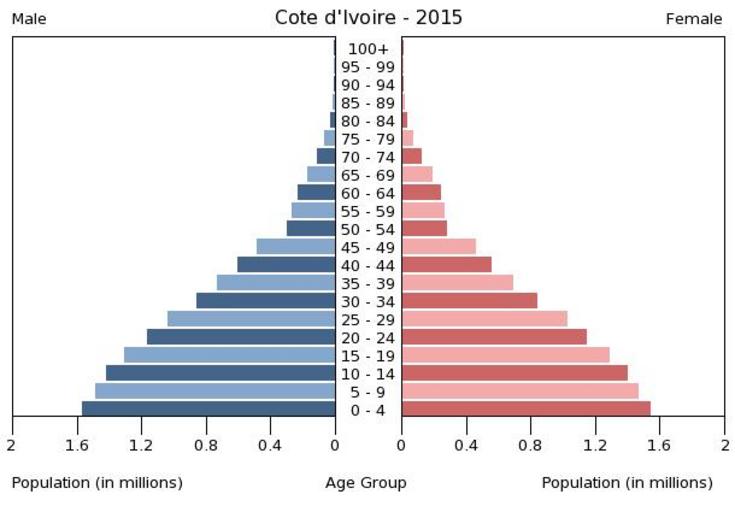 Keywords: Population pyramid of Cote d'Ivoire 2015.png en A population pyramid illustrates the age and sex structure of population and may provide insights about political and social stability as well as economic development The population is distributed along the horizontal axis with males shown on the left and females on the right The male and female populations are broken down into 5-year age groups represented as horizontal bars along the vertical axis with the youngest age groups at the bottom and the oldest at the top The shape of the population pyramid gradually evolves over time based on fertility mortality and international migration trends Віково-статева пі аміда населення Кот-д'Івуа у за 2015 ік Вона дає наочне уявлення п о вікову і статеву ст укту а населення к аїни може слугувати дже елом інфо мації п о політичну і соціальну стабільність економічний озвиток Блакитними кольо ами ліво уч у вигляді го изонтальних смуг показані вікові г упи по 5 оків кожна чоловічої статі п аво уч ожевими жіночої аймолодші вікові г упи внизу найста іші вго і Фо ма пі аміди поступово еволюціонує з плином часу під впливом чинників на оджуваності сме тності і світової міг ації https //www cia gov/library/publications/the-world-factbook/ The World Factbook 2016-09-21 The Central Intelligence Agency Цент альне озвідувальне уп авління PD-USGov Population pyramids of Cote d'Ivoire |
