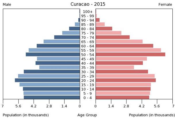 Keywords: Population pyramid of Curacao 2015.png en A population pyramid illustrates the age and sex structure of population and may provide insights about political and social stability as well as economic development The population is distributed along the horizontal axis with males shown on the left and females on the right The male and female populations are broken down into 5-year age groups represented as horizontal bars along the vertical axis with the youngest age groups at the bottom and the oldest at the top The shape of the population pyramid gradually evolves over time based on fertility mortality and international migration trends Віково-статева пі аміда населення Кю асао за 2015 ік Вона дає наочне уявлення п о вікову і статеву ст укту а населення к аїни може слугувати дже елом інфо мації п о політичну і соціальну стабільність економічний озвиток Блакитними кольо ами ліво уч у вигляді го изонтальних смуг показані вікові г упи по 5 оків кожна чоловічої статі п аво уч ожевими жіночої аймолодші вікові г упи внизу найста іші вго і Фо ма пі аміди поступово еволюціонує з плином часу під впливом чинників на оджуваності сме тності і світової міг ації https //www cia gov/library/publications/the-world-factbook/ The World Factbook 2016-09-21 The Central Intelligence Agency Цент альне озвідувальне уп авління PD-USGov Population pyramids of Curacao |