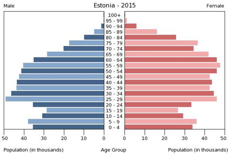Keywords: Population pyramid of Estonia 2015.png en A population pyramid illustrates the age and sex structure of population and may provide insights about political and social stability as well as economic development The population is distributed along the horizontal axis with males shown on the left and females on the right The male and female populations are broken down into 5-year age groups represented as horizontal bars along the vertical axis with the youngest age groups at the bottom and the oldest at the top The shape of the population pyramid gradually evolves over time based on fertility mortality and international migration trends Віково-статева пі аміда населення Естонії за 2015 ік Вона дає наочне уявлення п о вікову і статеву ст укту а населення к аїни може слугувати дже елом інфо мації п о політичну і соціальну стабільність економічний озвиток Блакитними кольо ами ліво уч у вигляді го изонтальних смуг показані вікові г упи по 5 оків кожна чоловічої статі п аво уч ожевими жіночої аймолодші вікові г упи внизу найста іші вго і Фо ма пі аміди поступово еволюціонує з плином часу під впливом чинників на оджуваності сме тності і світової міг ації https //www cia gov/library/publications/the-world-factbook/ The World Factbook 2016-09-21 The Central Intelligence Agency Цент альне озвідувальне уп авління PD-USGov Population pyramids of Estonia |