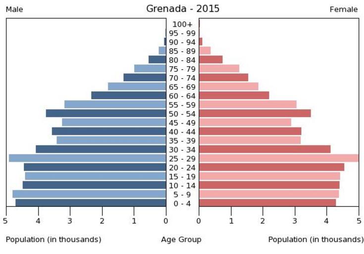 Keywords: Population pyramid of Grenada 2015.png en A population pyramid illustrates the age and sex structure of population and may provide insights about political and social stability as well as economic development The population is distributed along the horizontal axis with males shown on the left and females on the right The male and female populations are broken down into 5-year age groups represented as horizontal bars along the vertical axis with the youngest age groups at the bottom and the oldest at the top The shape of the population pyramid gradually evolves over time based on fertility mortality and international migration trends Віково-статева пі аміда населення Г енади за 2015 ік Вона дає наочне уявлення п о вікову і статеву ст укту а населення к аїни може слугувати дже елом інфо мації п о політичну і соціальну стабільність економічний озвиток Блакитними кольо ами ліво уч у вигляді го изонтальних смуг показані вікові г упи по 5 оків кожна чоловічої статі п аво уч ожевими жіночої аймолодші вікові г упи внизу найста іші вго і Фо ма пі аміди поступово еволюціонує з плином часу під впливом чинників на оджуваності сме тності і світової міг ації https //www cia gov/library/publications/the-world-factbook/ The World Factbook 2016-09-21 The Central Intelligence Agency Цент альне озвідувальне уп авління PD-USGov Population pyramids of Grenada |