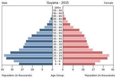 Keywords: Population pyramid of Guyana 2015.png en A population pyramid illustrates the age and sex structure of population and may provide insights about political and social stability as well as economic development The population is distributed along the horizontal axis with males shown on the left and females on the right The male and female populations are broken down into 5-year age groups represented as horizontal bars along the vertical axis with the youngest age groups at the bottom and the oldest at the top The shape of the population pyramid gradually evolves over time based on fertility mortality and international migration trends Віково-статева пі аміда населення Гайани за 2015 ік Вона дає наочне уявлення п о вікову і статеву ст укту а населення к аїни може слугувати дже елом інфо мації п о політичну і соціальну стабільність економічний озвиток Блакитними кольо ами ліво уч у вигляді го изонтальних смуг показані вікові г упи по 5 оків кожна чоловічої статі п аво уч ожевими жіночої аймолодші вікові г упи внизу найста іші вго і Фо ма пі аміди поступово еволюціонує з плином часу під впливом чинників на оджуваності сме тності і світової міг ації https //www cia gov/library/publications/the-world-factbook/ The World Factbook 2016-09-21 The Central Intelligence Agency Цент альне озвідувальне уп авління PD-USGov Population pyramids of Guyana |