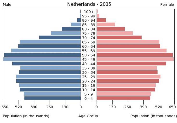 Keywords: Population pyramid of Netherlands 2015.png en A population pyramid illustrates the age and sex structure of population and may provide insights about political and social stability as well as economic development The population is distributed along the horizontal axis with males shown on the left and females on the right The male and female populations are broken down into 5-year age groups represented as horizontal bars along the vertical axis with the youngest age groups at the bottom and the oldest at the top The shape of the population pyramid gradually evolves over time based on fertility mortality and international migration trends Віково-статева пі аміда населення іде ландів за 2015 ік Вона дає наочне уявлення п о вікову і статеву ст укту а населення к аїни може слугувати дже елом інфо мації п о політичну і соціальну стабільність економічний озвиток Блакитними кольо ами ліво уч у вигляді го изонтальних смуг показані вікові г упи по 5 оків кожна чоловічої статі п аво уч ожевими жіночої аймолодші вікові г упи внизу найста іші вго і Фо ма пі аміди поступово еволюціонує з плином часу під впливом чинників на оджуваності сме тності і світової міг ації https //www cia gov/library/publications/the-world-factbook/ The World Factbook 2016-09-21 The Central Intelligence Agency Цент альне озвідувальне уп авління PD-USGov Population pyramids of the Netherlands |