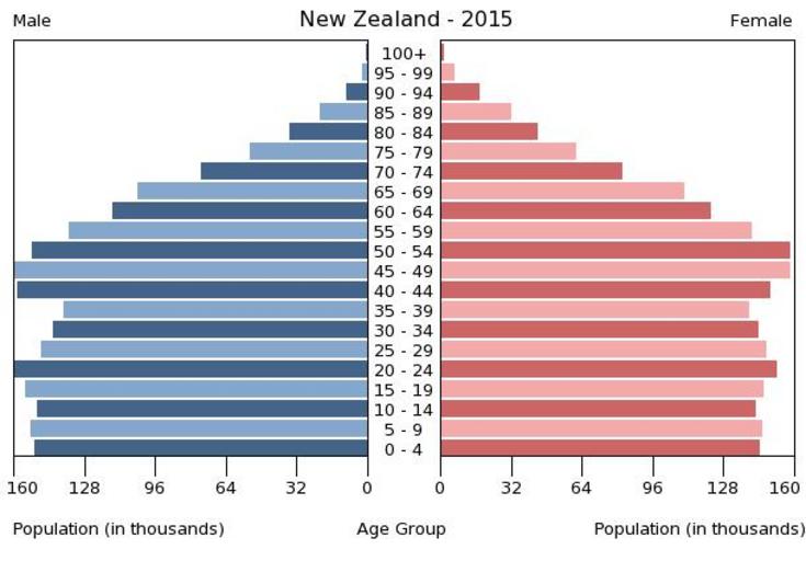 Keywords: Population pyramid of New Zealand 2015.png en A population pyramid illustrates the age and sex structure of population and may provide insights about political and social stability as well as economic development The population is distributed along the horizontal axis with males shown on the left and females on the right The male and female populations are broken down into 5-year age groups represented as horizontal bars along the vertical axis with the youngest age groups at the bottom and the oldest at the top The shape of the population pyramid gradually evolves over time based on fertility mortality and international migration trends Віково-статева пі аміда населення ової Зеландії за 2015 ік Вона дає наочне уявлення п о вікову і статеву ст укту а населення к аїни може слугувати дже елом інфо мації п о політичну і соціальну стабільність економічний озвиток Блакитними кольо ами ліво уч у вигляді го изонтальних смуг показані вікові г упи по 5 оків кожна чоловічої статі п аво уч ожевими жіночої аймолодші вікові г упи внизу найста іші вго і Фо ма пі аміди поступово еволюціонує з плином часу під впливом чинників на оджуваності сме тності і світової міг ації https //www cia gov/library/publications/the-world-factbook/ The World Factbook 2016-09-21 The Central Intelligence Agency Цент альне озвідувальне уп авління PD-USGov Population pyramids of New Zealand |