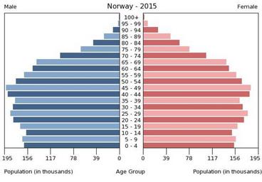 Keywords: Population pyramid of Norway 2015.png en A population pyramid illustrates the age and sex structure of population and may provide insights about political and social stability as well as economic development The population is distributed along the horizontal axis with males shown on the left and females on the right The male and female populations are broken down into 5-year age groups represented as horizontal bars along the vertical axis with the youngest age groups at the bottom and the oldest at the top The shape of the population pyramid gradually evolves over time based on fertility mortality and international migration trends Віково-статева пі аміда населення о вегії за 2015 ік Вона дає наочне уявлення п о вікову і статеву ст укту а населення к аїни може слугувати дже елом інфо мації п о політичну і соціальну стабільність економічний озвиток Блакитними кольо ами ліво уч у вигляді го изонтальних смуг показані вікові г упи по 5 оків кожна чоловічої статі п аво уч ожевими жіночої аймолодші вікові г упи внизу найста іші вго і Фо ма пі аміди поступово еволюціонує з плином часу під впливом чинників на оджуваності сме тності і світової міг ації https //www cia gov/library/publications/the-world-factbook/ The World Factbook 2016-09-21 The Central Intelligence Agency Цент альне озвідувальне уп авління PD-USGov Population pyramids of Norway |