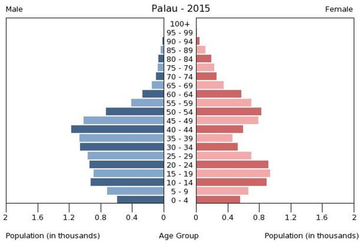 | Keywords: Population pyramid of Palau 2015.png en A population pyramid illustrates the age and sex structure of population and may provide insights about political and social stability as well as economic development The population is distributed along the horizontal axis with males shown on the left and females on the right The male and female populations are broken down into 5-year age groups represented as horizontal bars along the vertical axis with the youngest age groups at the bottom and the oldest at the top The shape of the population pyramid gradually evolves over time based on fertility mortality and international migration trends Віково-статева пі аміда населення Палау за 2015 ік Вона дає наочне уявлення п о вікову і статеву ст укту а населення к аїни може слугувати дже елом інфо мації п о політичну і соціальну стабільність економічний озвиток Блакитними кольо ами ліво уч у вигляді го изонтальних смуг показані вікові г упи по 5 оків кожна чоловічої статі п аво уч ожевими жіночої аймолодші вікові г упи внизу найста іші вго і Фо ма пі аміди поступово еволюціонує з плином часу під впливом чинників на оджуваності сме тності і світової міг ації https //www cia gov/library/publications/the-world-factbook/ The World Factbook 2016-09-21 The Central Intelligence Agency Цент альне озвідувальне уп авління PD-USGov Population pyramids of Palau |