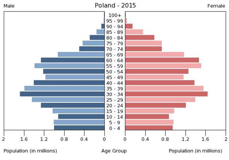 Keywords: Population pyramid of Poland 2015.png en A population pyramid illustrates the age and sex structure of population and may provide insights about political and social stability as well as economic development The population is distributed along the horizontal axis with males shown on the left and females on the right The male and female populations are broken down into 5-year age groups represented as horizontal bars along the vertical axis with the youngest age groups at the bottom and the oldest at the top The shape of the population pyramid gradually evolves over time based on fertility mortality and international migration trends Віково-статева пі аміда населення Польщі за 2015 ік Вона дає наочне уявлення п о вікову і статеву ст укту а населення к аїни може слугувати дже елом інфо мації п о політичну і соціальну стабільність економічний озвиток Блакитними кольо ами ліво уч у вигляді го изонтальних смуг показані вікові г упи по 5 оків кожна чоловічої статі п аво уч ожевими жіночої аймолодші вікові г упи внизу найста іші вго і Фо ма пі аміди поступово еволюціонує з плином часу під впливом чинників на оджуваності сме тності і світової міг ації https //www cia gov/library/publications/the-world-factbook/ The World Factbook 2016-09-21 The Central Intelligence Agency Цент альне озвідувальне уп авління PD-USGov Population pyramids of Poland |