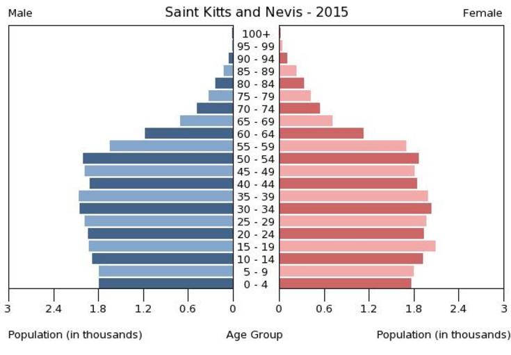 Keywords: Population pyramid of Saint Kitts and Nevis 2015.png en A population pyramid illustrates the age and sex structure of population and may provide insights about political and social stability as well as economic development The population is distributed along the horizontal axis with males shown on the left and females on the right The male and female populations are broken down into 5-year age groups represented as horizontal bars along the vertical axis with the youngest age groups at the bottom and the oldest at the top The shape of the population pyramid gradually evolves over time based on fertility mortality and international migration trends Віково-статева пі аміда населення Сент-Кіттсу і евісу за 2015 ік Вона дає наочне уявлення п о вікову і статеву ст укту а населення к аїни може слугувати дже елом інфо мації п о політичну і соціальну стабільність економічний озвиток Блакитними кольо ами ліво уч у вигляді го изонтальних смуг показані вікові г упи по 5 оків кожна чоловічої статі п аво уч ожевими жіночої аймолодші вікові г упи внизу найста іші вго і Фо ма пі аміди поступово еволюціонує з плином часу під впливом чинників на оджуваності сме тності і світової міг ації https //www cia gov/library/publications/the-world-factbook/ The World Factbook 2016-09-21 The Central Intelligence Agency Цент альне озвідувальне уп авління PD-USGov Population pyramids of Saint Kitts and Nevis |