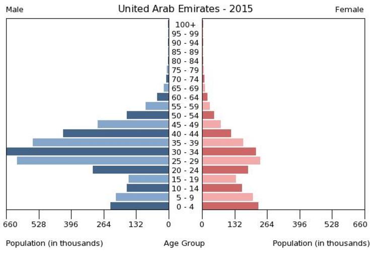 | Keywords: Population pyramid of United Arab Emirates 2015.png  en A population pyramid illustrates the age and sex structure of population and may provide insights about political and social stability as well as economic development The population is distributed along the horizontal axis with males shown on the left and females on the right The male and female populations are broken down into 5-year age groups represented as horizontal bars along the vertical axis with the youngest age groups at the bottom and the oldest at the top The shape of the population pyramid gradually evolves over time based on fertility mortality and international migration trends Віково-статева пі аміда населення Об'єднаних А абських Емі атів за 2015  ік Вона дає наочне уявлення п о вікову і статеву ст укту а населення к аїни може слугувати дже елом інфо мації п о політичну і соціальну стабільність економічний  озвиток Блакитними кольо ами ліво уч у вигляді го изонтальних смуг показані вікові г упи по 5  оків кожна чоловічої статі п аво уч  ожевими  жіночої  аймолодші вікові г упи  внизу найста іші  вго і Фо ма пі аміди поступово еволюціонує з плином часу під впливом чинників на оджуваності сме тності і світової міг ації https //www cia gov/library/publications/the-world-factbook/ The World Factbook 2016-09-21 The Central Intelligence Agency Цент альне  озвідувальне уп авління PD-USGov Population pyramids of the United Arab Emirates |