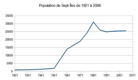 | Keywords: Population Sept-Îles 1921-2006.png fr Population de Sept-Îles entre 1921 et 2006 1921 formatnum 870 1931 formatnum 1000 1941 formatnum 1300 1951 formatnum 1900 1961 formatnum 14000 1971 formatnum 19000 1976 formatnum 24000 1981 formatnum 31000 1986 formatnum 26000 Valeur réelle formatnum 25637 1991 formatnum 24848 1996 formatnum 25224 2001 formatnum 25392 2006 formatnum 25514 Valeurs selon Veyron Michel Dictionnaire canadien des noms propres Éditions Larousse Louiseville Québec 1989 764 p Page 647 ISBN 2-920318-06-3 http //www12 statcan ca/english/Profil/Details/details1 cfm SEARCH BEGINS ID 6469 PSGC 24 SGC 2497010 DataType 1 LANG F Province 24 PlaceName Sept CMA 412 CSDNAME Sept 2DIles A TypeNameF Ville Recensement 1996 Statistique Canada http //www12 statcan ca/census-recensement/2006/dp-pd/prof/92-591/details/Page cfm Lang F Geo1 CSD Code1 2497007 Geo2 PR Code2 24 Data Count SearchText Sept- FDles SearchType Begins SearchPR 01 B1 All Custom Recensement 2006 Statistique Canada http //www stat gouv qc ca/publications/regional/pdf/r09-t1-5 pdf Chiffres de population 1996 1991 et 1986 Institut de la statistique du Québec 2011-10-28 own UncivilFire cc-zero Uploaded with UploadWizard Sept-Îles Images by Samuel Frenette |