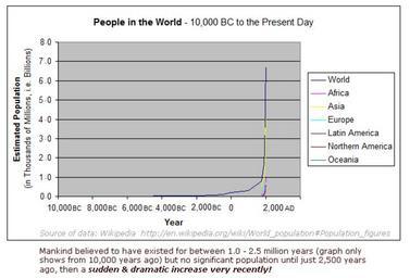 | Keywords: Population-since-10000BC-.jpg Note a Minimal population for over 1 million years of human history only last 10 000 years shown on graph b Steady growth began around 500BC c Growth accelerated noticeably from around 1000AD onwards d yet faster growth from around 1800AD e Dramatic growth since 1950 to the present day with even more forecast Own work - chart developed based on data found on http //en wikipedia org/wiki/World_population Population_figures BS 2009-01-24 Temporal population graphs |