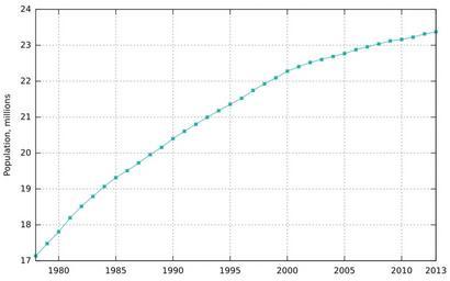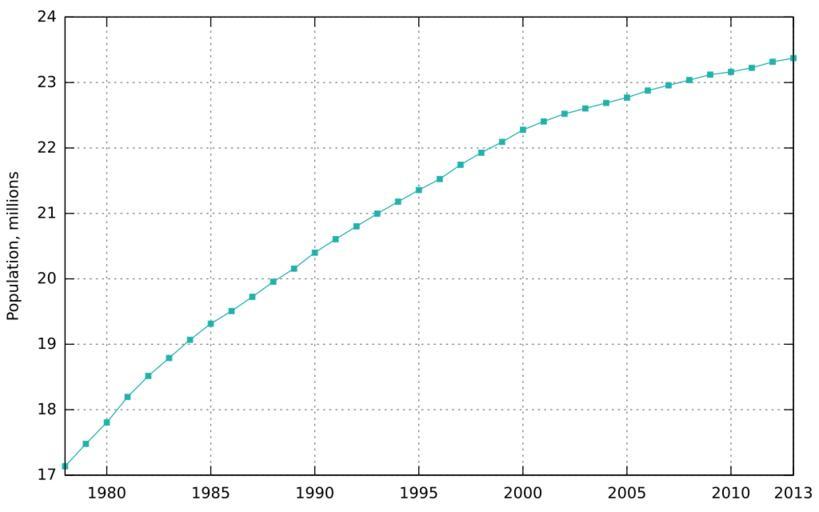 | Keywords: Population of Taiwan since 1978.svg en Taiwan's population since 1978 Own work by uploader SVG manually edited to support other languages Gnuplot Demmo 2015-09-15 Population of Taiwan since 1978 ar png Sources http //eng stat gov tw National Statistics Republic of China Taiwan Category Population and Housing http //eng stat gov tw/lp asp ctNode 2265 CtUnit 1072 BaseDSD 36 Yearly staistics Table 02-01 http //eng stat gov tw/public/data/dgbas03/bs2/yearbook_eng/y008 pdf end of year data Gnuplot gnuplot 4 6 patchlevel 4 <source lang gnuplot > set term svg size 800 500 dynamic font sans-serif set autoscale xfix set grid set style data linespoints set pointsize 0 6 unset key set ylabel Population millions set xtics add 2013 Added for clarity may be omitted if necessary plot population txt using 1 2/1000000 linetype rgb 20B2AA pt 5 </source> Data file population txt <pre> 1978 17135714 8956557 8179157 1 92 109 5 4 99 476 1 19 43 1979 17479314 9126925 8352389 2 01 109 3 4 86 485 5 19 68 1980 17805067 9288199 8516868 1 86 109 1 4 76 494 6 18 62 1981 18193955 9479508 8714447 1 84 108 8 4 66 502 9 18 13 1982 18515754 9636285 8879469 1 77 108 5 4 58 511 8 17 31 1983 18790538 9769572 9020966 1 48 108 3 4 52 519 4 15 68 1984 19069194 9904853 9164341 1 48 108 1 4 48 527 1 14 85 1985 19313825 10023344 9290481 1 28 107 9 4 42 533 8 13 23 1986 19509082 10114710 9394372 1 01 107 7 4 34 539 2 11 03 1987 19725010 10217434 9507576 1 11 107 5 4 24 545 2 11 10 1988 19954397 10328081 9626316 1 16 107 3 4 14 551 5 12 09 1989 20156587 10424102 9732485 1 01 107 1 4 06 557 1 10 57 1990 20401305 10540635 9860670 1 21 106 9 4 00 563 9 11 34 1991 20605831 10640276 9965555 1 00 106 8 3 94 569 5 10 52 1992 20802622 10734609 10068013 0 96 106 6 3 88 575 0 10 20 1993 20995416 10824161 10171255 0 93 106 4 3 82 580 3 10 27 1994 21177874 10907032 10270842 0 87 106 2 3 75 585 3 9 91 1995 21357431 10990657 10366774 0 85 106 0 3 67 590 3 9 90 1996 21525433 11065798 10459635 0 79 105 8 3 57 594 9 9 47 1997 21742815 11163764 10579051 1 01 105 5 3 50 600 8 9 48 1998 21928591 11243408 10685183 0 85 105 2 3 44 606 0 6 79 1999 22092387 11312728 10779659 0 75 105 0 3 38 610 5 7 16 2000 22276672 11392050 10884622 0 83 104 7 3 33 615 6 8 08 2001 22405568 11441651 10963917 0 58 104 4 3 29 619 1 5 94 2002 22520776 11485409 11035367 0 51 104 1 3 25 622 3 5 29 2003 22604550 11515062 11089488 0 37 103 8 3 21 624 6 4 27 2004 22689122 11541585 11147537 0 37 103 5 3 16 627 0 3 59 2005 22770383 11562440 11207943 0 36 103 2 3 12 629 2 2 92 2006 22876527 11591707 11284820 0 47 102 7 3 09 632 2 3 01 2007 22958360 11608767 11349593 0 36 102 3 3 06 634 4 2 76 2008 23037031 11626351 11410680 0 34 101 9 3 01 636 6 2 40 2009 23119772 11636734 11483038 0 36 101 3 2 96 638 8 2 07 2010 23162123 11635225 11526898 0 18 100 9 2 92 640 0 0 91 2011 23224912 11645674 11579238 0 27 100 6 2 88 641 7 1 88 2012 23315822 11673319 11642503 0 39 100 3 2 85 644 2 3 23 2013 23373517 11684674 11688843 0 25 100 0 2 82 645 8 1 85 </pre> Temporal population graphs Taiwan Demographics of Taiwan |
