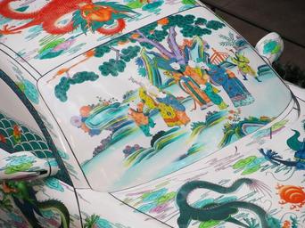 Keywords: porsche car vehicle painted windshield asian oriental motif theme art artwork colorful elaborate artistic expression