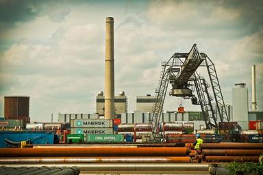 Keywords: port crane harbour crane envelope loading crane rhine industry inland port cargo transport of goods marketing hub kontor düsseldorf neuss transport inland waterway transport container terminal pipes steel chimney industrial plant metal