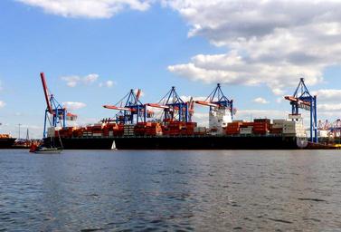 Keywords: port of hamburg blue sky clouds container terminal discharge loading crane ship hamburg sky port elbe blue water panorama landungsbrücken anchorage hanseatic outlook