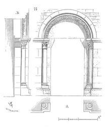 | Keywords: Porte.eglise.Beaune.png Sur le flanc sud de la nef de l'église de Beaune on voit encore une fort jolie porte de ce genre parfaitement conservée Les pieds-droits sont accompagnés de deux colonnettes et l'archivolte est ornée d'un gros boudin sculpté fig 73 Cette porte date de 1140 environ En A nous en donnons le plan et en B la coupe Cette porte possédait deux vantaux Viollet-le-Duc Portals Viollet-le-Duc Romanesque architecture Viollet-le-Duc | ||||