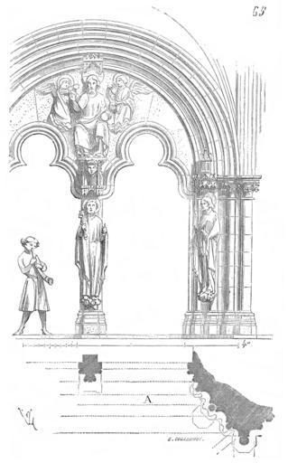 | Keywords: Porte.eglise.Saint.Pierre.sous.Vezelay.png Il existe encore sous le porche de l'église de Saint-Père ou plutôt de Saint-Pierre-sous-Vézelay Yonne une porte fort dégradée aujourd'hui mais dont la composition est empreinte à un degré remarquable des qualités que nous venons de signaler Cette porte fig 65 qui date de 1240 environ quoique d'une petite dimension est conçue évidemment par un artiste du premier ordre Elle se trouvait percée primitivement sous le pignon dont nous avons donné l'élévation Viollet-le-Duc Portals Viollet-le-Duc Interior of église de Saint-Père-sous-Vézelay |