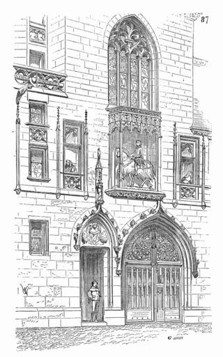 | Keywords: Porte.Hotel.Jacques.Coeur.Bourges.2.png Le XV<sup>e</sup> siècle pendant lequel on bâtit peu d'églises vit élever une quantité de châteaux de palais et maisons dont les portes extérieures étaient décorées de sculptures de figures et d'armoiries Parmi ces portes de palais du XV<sup>e</sup> siècle nous devons placer en première ligne celle de l'hôtel de Jacques Cœur à Bourges presque intacte encore aujourd'hui Ce fut en 1443 que le célèbre trésorier de Charles VII commença la construction de cette belle résidence Arrêté en 1451 à Taillebourg sur l'ordre du roi par Olivier Coetivi Jacques Cœur put à peine jouir de l'hôtel qu'il avait fait construire dans sa ville natale Le portail de cet hôtel fig 87 est percé sous un pavillon rectangulaire qui occupe à peu près le milieu de la façade sur la rue Viollet-le-Duc Drawings by Eugène Viollet-le-Duc Door palais Jacques-Cœur Gothic portals in Centre |