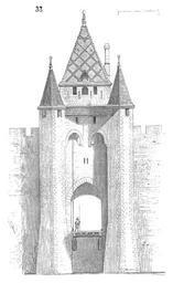 | Keywords: Porte.Villeneuve.sur.Yonne.2.png l'élévation extérieure de la porte de Villeneuve-sur-Yonne Cette élévation fait saisir la double fonction des mâchicoulis obliques Toute cette construction est élevée en cailloux de meulière avec chaînes de pierre aux angles Elle est bien traitée et les mortiers en sont excellents C'est peut-être à la bonté de cette construction et au peu de valeur des matériaux que nous devons sa conservation Une coupe longitudinale faite sur la partie antérieure de la porte fig 33 fait voir la manœuvre du pont-levis et son mécanisme Des contre-poids suspendus en arrière des deux longrines du tablier facilitaient son relèvement lorsqu'on appuyait sur le treuil T La première herse abaissée le mâchicoulis qui la protége était ouvert aux défenseurs Dans cet exemple comme dans tous ceux précédemment donnés la défense n'agit que du sommet de la porte et par la disposition des échauguettes et des grands mâchicoulis obliques le fossé ainsi que les abords du pont pouvaient être couverts de projectiles Viollet-le-Duc Portes de Sens et de Joigny Gothic portals |