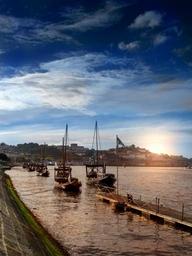 Keywords: porto sunset dusk portugal boats clouds horizon sun silhouettes river shore backlight spring afternoon landscape twilight