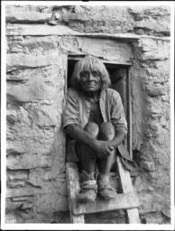 | Keywords: Portrait of an old Hopi Indian man sitting in the tiny wood-framed doorway on the second story of a house at Oraibi, Arizona, 1898 (CHS-4585).jpg en <br> Portrait of an old Hopi Indian man sitting in the tiny wood-framed doorway on the second story of a house at Oraibi Arizona 1898 Photographic portrait of an old Hopi Indian man sitting in the tiny wood-framed doorway of the second story of a house at Oraibi Arizona 1898 He clasps his wrists around his knees while his feet rest on the top rung of a ladder The man has long gray hair and wrinkled skin and is looking straight ahead He wears a short-sleeved shirt and moccasins Call number CHS-4585 Legacy record ID chs-m16916; USC-1-1-1-13518 Photographer James George Wharton Filename CHS-4585 Coverage date 1898 Part of collection California Historical Society Collection 1860-1960 Type images Geographic subject city or populated place Oraibi Repository name USC Libraries Special Collections Accession number 4585 Microfiche number 1-168- Archival file chs_Volume96/CHS-4585 tiff Part of subcollection Title Insurance and Trust and C C Pierce Photography Collection 1860-1960 Repository address Doheny Memorial Library Los Angeles CA 90089-0189 Geographic subject country USA Format aacr2 2 photographs glass photonegative photoprint b w ; 22 x 17 cm Rights Digitally reproduced by the USC Digital Library; From the California Historical Society Collection at the University of Southern California Subject adlf tribal areas Project USC Repository email specol usc edu Identifying number unidentified no James-39 Contributing entity California Historical Society Date created 1898 Publisher of the digital version University of Southern California Libraries Format aat photographic prints; photographs Geographic subject state Arizona Subject file heading Indians -- Hopi -- General Format glass plate negatives Access conditions Send requests to address or e-mail given Phone 213 821-2366; fax 213 740-2343 Geographic subject county Navajo Subject lcsh Indians of North America; Hopi Indians 1898 date created George Wharton James 1858 1923 http //digitallibrary usc edu/cdm/ref/collection/p15799coll65/id/16838 PD-old-70-1923 Images from USC Digital Library uploaded by Fæ Photographs by George Wharton James California Historical Society Collection 1860-1960 Glass plate negatives Hopi men |